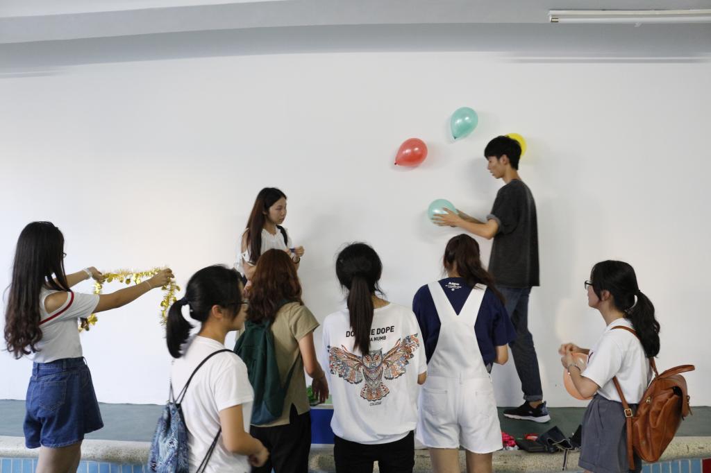为了充分筹备明天举行的开幕式、给予小学生一个良好的体验,队员们分工合作对学校小礼堂进行了布置,包括吹气球、挂气球、挂彩带、打扫卫生、调试音响设备等,并用紫色和黄色的彩带在门口贴了两个心形,用金色、绿色的彩带在墙壁上制造了美丽的波纹。