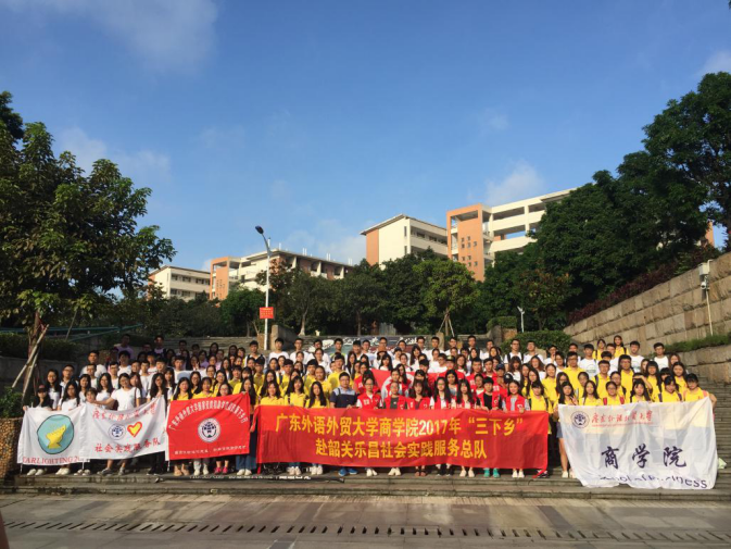 本网讯广东外语外贸大学商学院2017“三下乡”赴韶关乐昌社会实践服务总队于7月10日上午7点集合,为此次三下乡之行拉开帷幕。第一张大合照,展示了服务队整个团体良好的精神风貌与团结一致的品质,团队8点准时出发,1点到达目的地---廊田中学。在做了简单的整理收拾,并按时举办了廊田中学暑假夏令营的开学典礼。