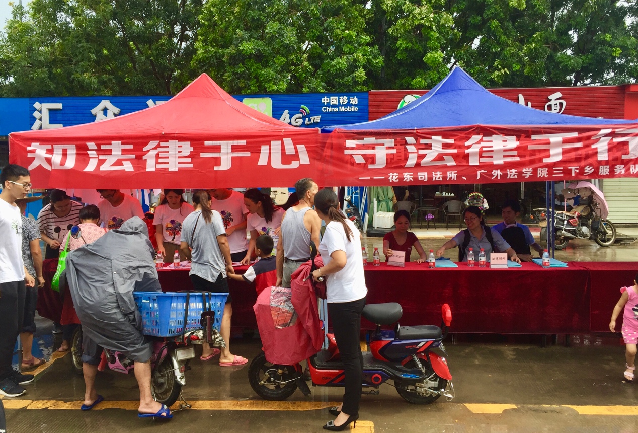 本网讯2017年7月11日,广外法学院Forever三下乡服务队的普法组同学外出进行普法活动。这一次的活动是与花东镇司法所的工作人员联合举办的,地点选在附近人流量较大的花东市场。