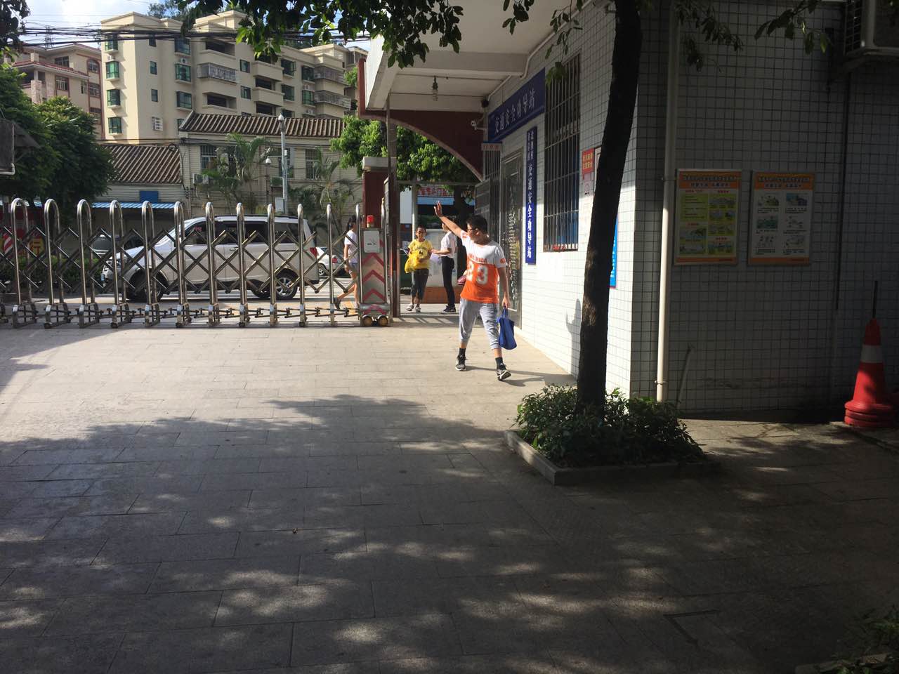 一名学生在向他的父母招手,校门前是义教的老师在等待还未到来的学生