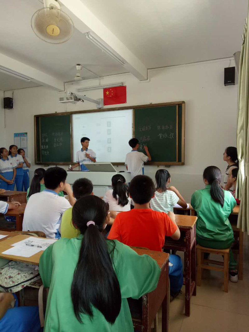 早会结束后,学生们陆续回到教室并根据队员们之前拟好的座位表分组落座。面对着熟悉的环境但相对陌生的同学以及完全未知的来自广外的哥哥姐姐们,学生们充满着新奇与期待。首先是队长李芷晴和副队长郑嘉雯作简单的自我介绍和队伍介绍,并传达此次三下乡能与小朋友们有一个圆满的共同成长的10天的目标与期望。接着就是各组队员一次进行自我介绍。义教组组员方燕珊的一句话道出了义教组的心声,“我们每个人都是第一次当小老师,有些紧张,有些忐忑,但我们都会努力做好!”。另一位组员刘紫荆更是以诙谐的语气说出了队伍的责任:“你们每个人都是我们的小太阳,我们将会一直围绕着你们公转!”