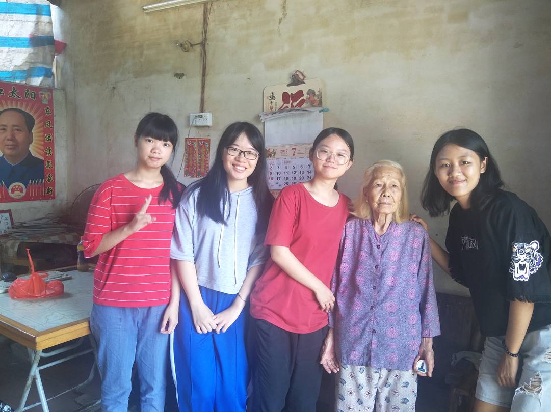 在镇上的购物广场购买好卷筒纸巾、洗衣粉和水果篮,穿梭过细窄的小街与巷子,由涵韵·流光志愿服务队队长带领的小队来到半边街的贫困低保户老人家中。对于同学们的到来与慰问,老人看起来十分开心,与同学们聊起家长里短,聊起战争年代那段令她不禁热泪盈眶的艰难日子,也聊起在党和政府的支持与建设下浛洸镇沧海桑田般的变化。老人的家里确实是物质缺乏的,但这位老人却始终认为生活甜美,她知足、乐观而且对生活充满感激,贫穷与命运的坎坷在九十多年的岁月沉淀后让她愈发坚毅。最后,同学们还与这位可爱的老人拍了一张合照。