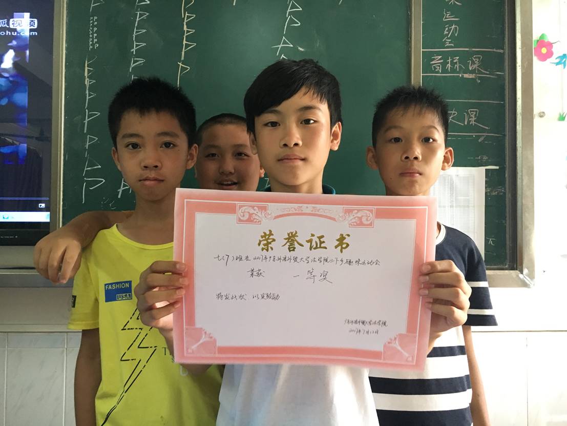时至中午,最后一个项目比比谁大力,引来了各班级的观赛,最后八班获得胜利,趣味运动会完美落幕,由于时间正值午饭时间,颁奖时间推迟到下午。下午文娱组的工作人员将奖状和奖品送到班级,由班主任和助教老师给学生代表颁发了奖状。奖项设立分别是:一等奖1名,二等奖2名,三等奖4名以及最佳风采奖1名。七班在运动会中表现突出,荣获一等奖,同时二班同学风采过人,荣获最佳风采奖。