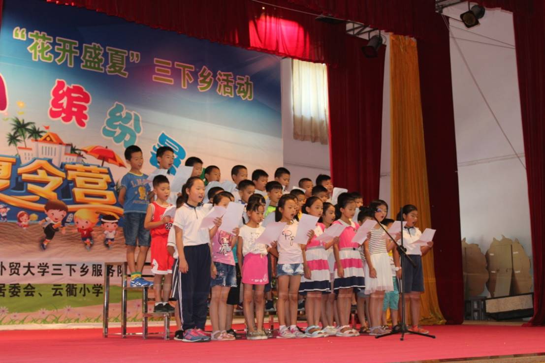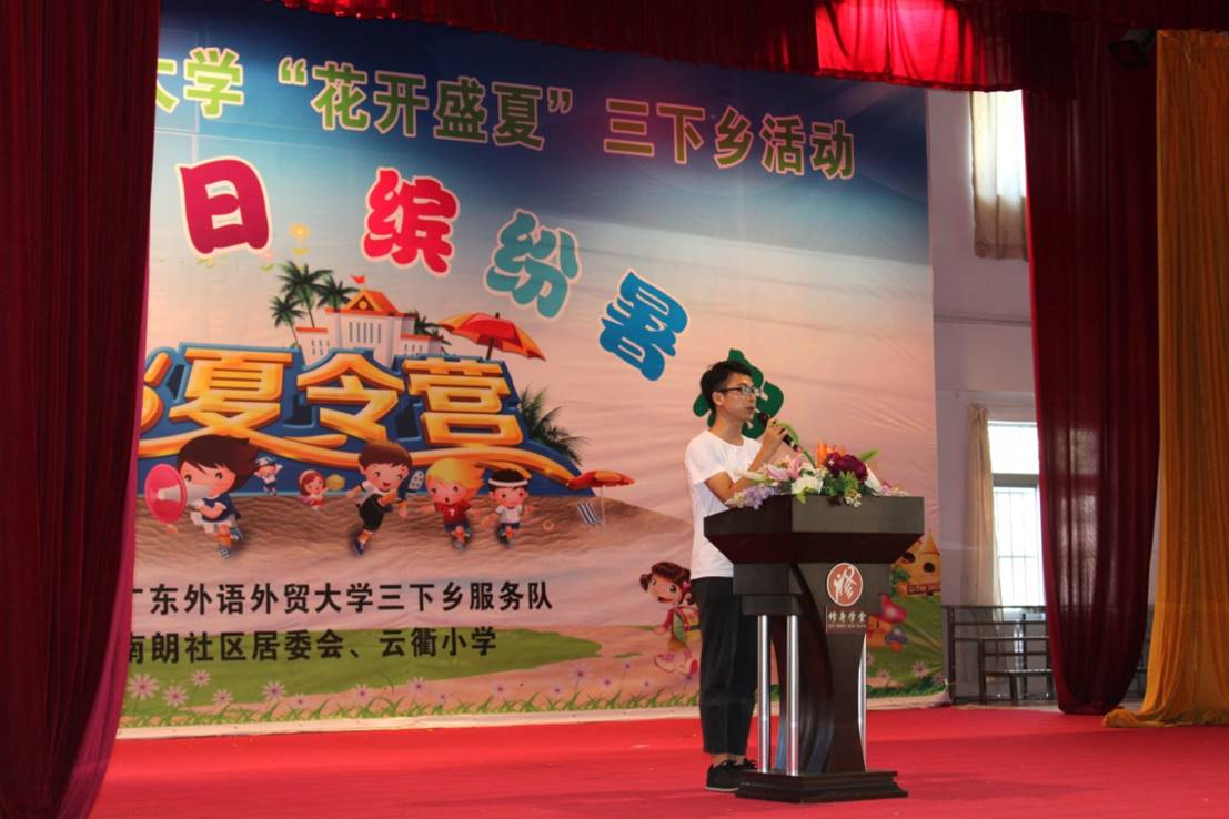 本网讯7月12日上午,我校马克思学院“花开盛夏”三下乡服务队在中山市云衢小学大会堂正式举办开幕仪式。参与此次开幕仪式的有:南朗镇关工委常务主任汤建良,主任陈月辉、主任林近和,南朗镇南朗村委副主任李庆美,南朗镇南朗社区居委会副书记甘文兴,云衢小学校长程杰军,学校行政、老师,学生家长,以及三至五年级一百余名学生。