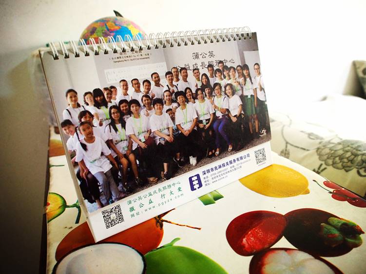 一进徐奶奶家,便看到了立在柜顶的台历,上面是2015年蒲公英志愿者与学生的合照,而在电视机旁则摆放着2016年的蒲公英公益台历。据说这台历每年都有,上面记录着一年以来蒲公英公益成长服务中心所做过的公益事迹。支助蒲公英公益项目的老板将此台历分发到志愿者手中,大概是希望以这种方式,让志愿行动伴随生活的每一刻,让志愿信念常伴志愿者心。