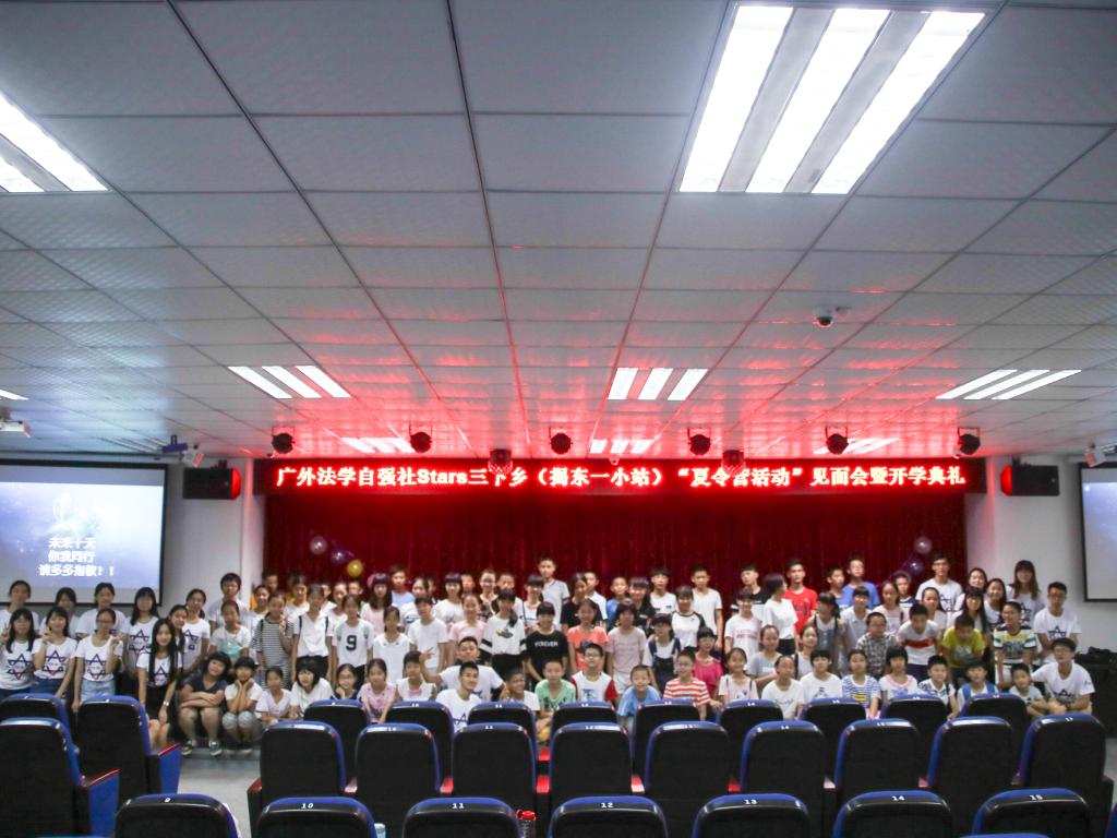 本网讯7月13日是“STARS”三下乡服务队队员与揭东区第一小学同学们第一次见面的日子。STARS的队员们与同学们在该校学术报告厅举办了隆重的开学典礼。经过一个月漫长的准备,队员们终于与活泼可爱的同学们开始了互动。