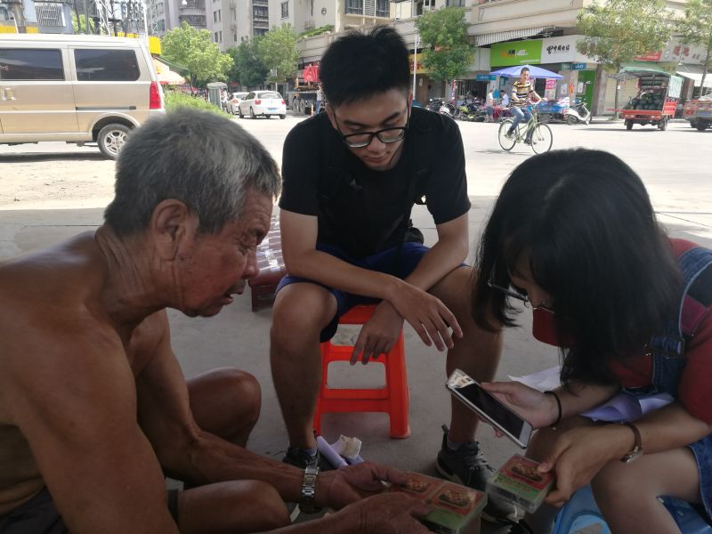 感受到了老人的热情,调研小组中的汕头成员连忙出马,为这位不能识字的老人进行问卷的讲解。随后,对于一道简单的问答题,老人也能用汕头话补充出很多内容。他的手指会不由自主地随着自己地语调变化而上下挥舞,腰板挺直向前,倾向调研小组成员的方向。有的时候一次性讲完一大段话,他的身体就会轻微地放松,靠进了小板凳里,后背又蜷缩了起来。交谈的过程里不仅老人回答了问卷相关内容,还追忆了以前汕头地区的潮剧状况,为调研小组成员掰着手指头,细数了许多过去潮剧的老演员。