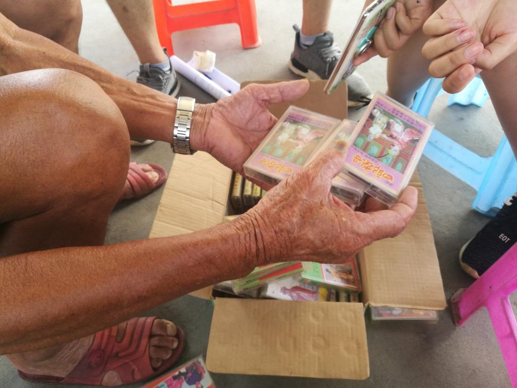 “哇,老古董哎!“调研组的同学啧啧称奇,连忙每人拿起几卷来看,而老人也兴致勃勃地给每一卷磁带做介绍。“工作的时候买了磁带,放来听。”他的话讲得并不怎么流畅,有些磕磕碰碰,可以说得上有些笨拙,但他对于调研的配合以及对潮剧的热情却让人感动。