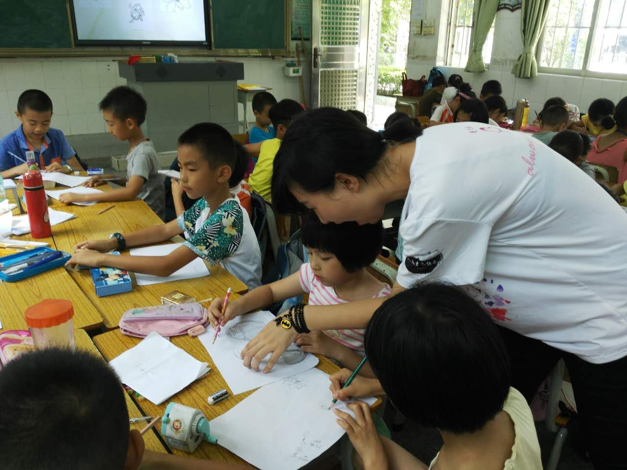 本网讯今天7月13日是由马克思主义学院的韩娟美老师指导的“爱飞翔·阳光天使志愿服务队”来到穗石小学正式开展义教活动的第二天,一切工作都在有条不紊地进行着。课间,三下乡队伍的指导老师韩娟美老师也莅临现场,观察志愿者与孩子们的相处情况,了解义教活动的相关进展状况。