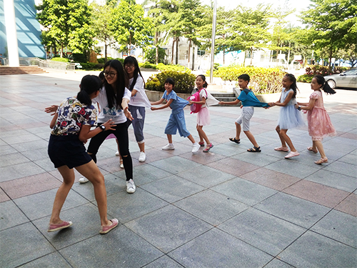 本网讯7月15日,国际商务英语学院CC Team在中山市东区水云轩小学开展的英语夏令营活动已经进行到第五天了。在此期间,小老师们不仅在课堂上与同学们进行深入的知识交流,并且在课外活动积极融入小朋友之中,在游戏中收获了快乐。