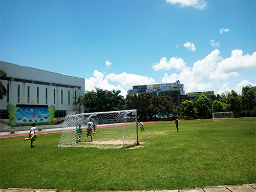 咦?哪里又发出了阵阵欢笑声?原来是球场上,几个小朋友在和胡子文老师在踢足球。小朋友们踢球的技术令人叹服,前一秒还看到一群小朋友跟着滚动的足球奔跑,下一秒足球已经高高地飞起,落向了另一个方向。天空是一片悦目的湛蓝和层层的云朵,绿茵茵的球场上是欢快奔跑的小朋友们,它们共同组成了今年夏天最美的一道风景线。