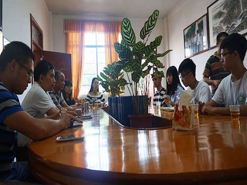 随后,我院领导与校方在会议室展开了工作汇报会议。“GRIT”服务队队长与各组组长向领导进行了工作总结汇报。队长谢勇生首先发表总结,简单地陈述了这几天各组的工作情况和未来的工作安排,指出服务队的工作基本顺利,正在有计划地进行当中。