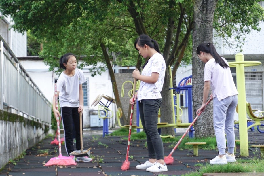 为保持校园内干净整洁、营造良好的学习及生活环境, 黎溪中学相关负责人来到学校,亲自指导学生打扫校园卫生。在“踏溪少年服务队”队员的带领下,同学们分组合作,分别打扫校园的不同区域。不少队员加入到学生中,共同清扫落叶、拾起草丛中的垃圾并清理校园里的垃圾池。虽然天气炎热,汗浸湿了衣裳,同学们也毫无怨言,尽心尽责。所谓“众人拾柴火焰高”,经过一节课的打扫,整个校园焕然一新。