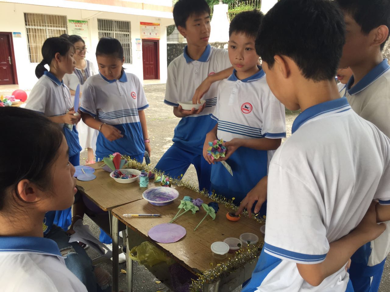 一下课,报名作为卖方的小组就开始一起制作手工作品,各色的彩纸和彩带在同学们的手中变换出了生动有趣的造型,体现出了他们的创造力和想象力。老师们也坐在同学们中间跟他们一起制作,给予他们必要的支持与鼓励。