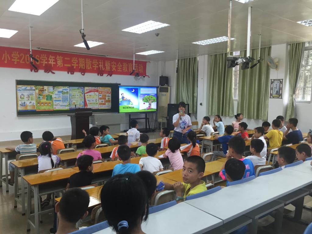 前期我校爱飞翔·薪火起航服务队志愿者进行了海报张贴及课程试讲等准备工作,在12点同学们进食午餐后,爱飞翔·方舟起航服务队的志愿者们带领着孩子有序地进入活动场地并就坐。12点30分,“科普你我他”进穗石小学科普活动正式开始。