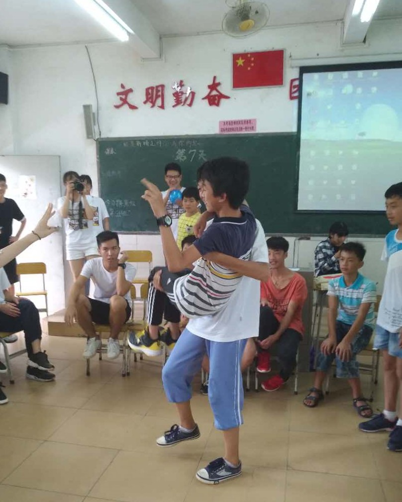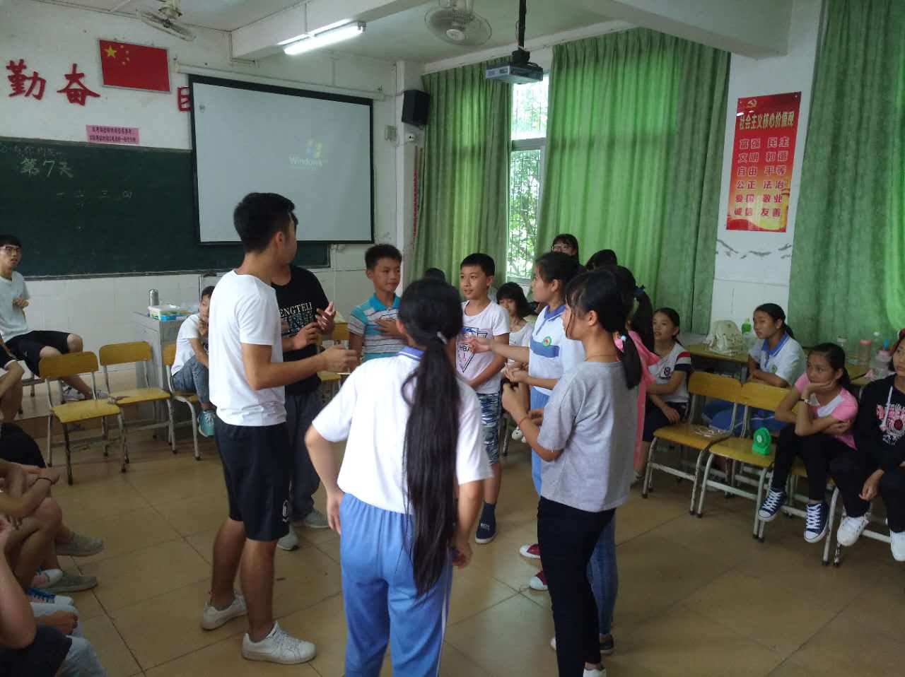上午九点,今天的第一节课是趣味数学课,李东锐给同学们讲授了如何画三视图。考虑到学生们来自小学和初中不同年级,所以老师们在课程设计时特意考虑了趣味性跟互动性,好让同学们听得津津有味。第二节英语课上,王颖诗老师教同学们如何用英语描述外貌——“The girl in white cloth is my friend那个穿白色衣服的女孩是我的朋友”,在这节课上,同学们学到了许多实用的英语表达。第三节课上,队员们向学生们介绍了东北话、潮汕话和重庆话三中各有特色的方言,让同学们感受到了中国语言的独特魅力。