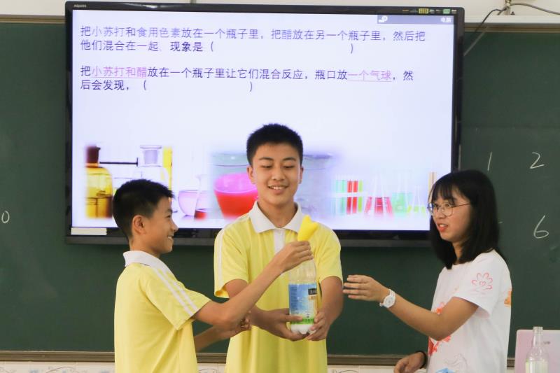 被问及“最期待的课程是什么”时,凝光一班的学生都不约而同地回答“化学课”。果不其然, “趣味化学”课上,出于对化学的好奇,学生们热情高涨,通过老师对化学变化、化学元素、元素周期表等内容的介绍走进并了解了奇妙的化学世界。之后的实验更是点燃了现场热烈的气氛。在老师的带领下,同学们纷纷上台动手操作,仔细观察实验现象,从小变化中感受大奥秘,从小实验中学习大化学。