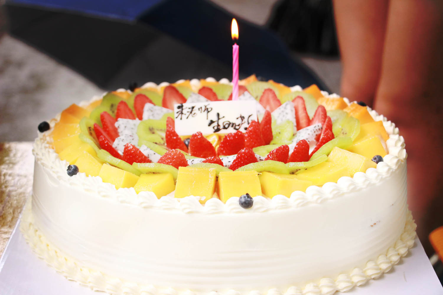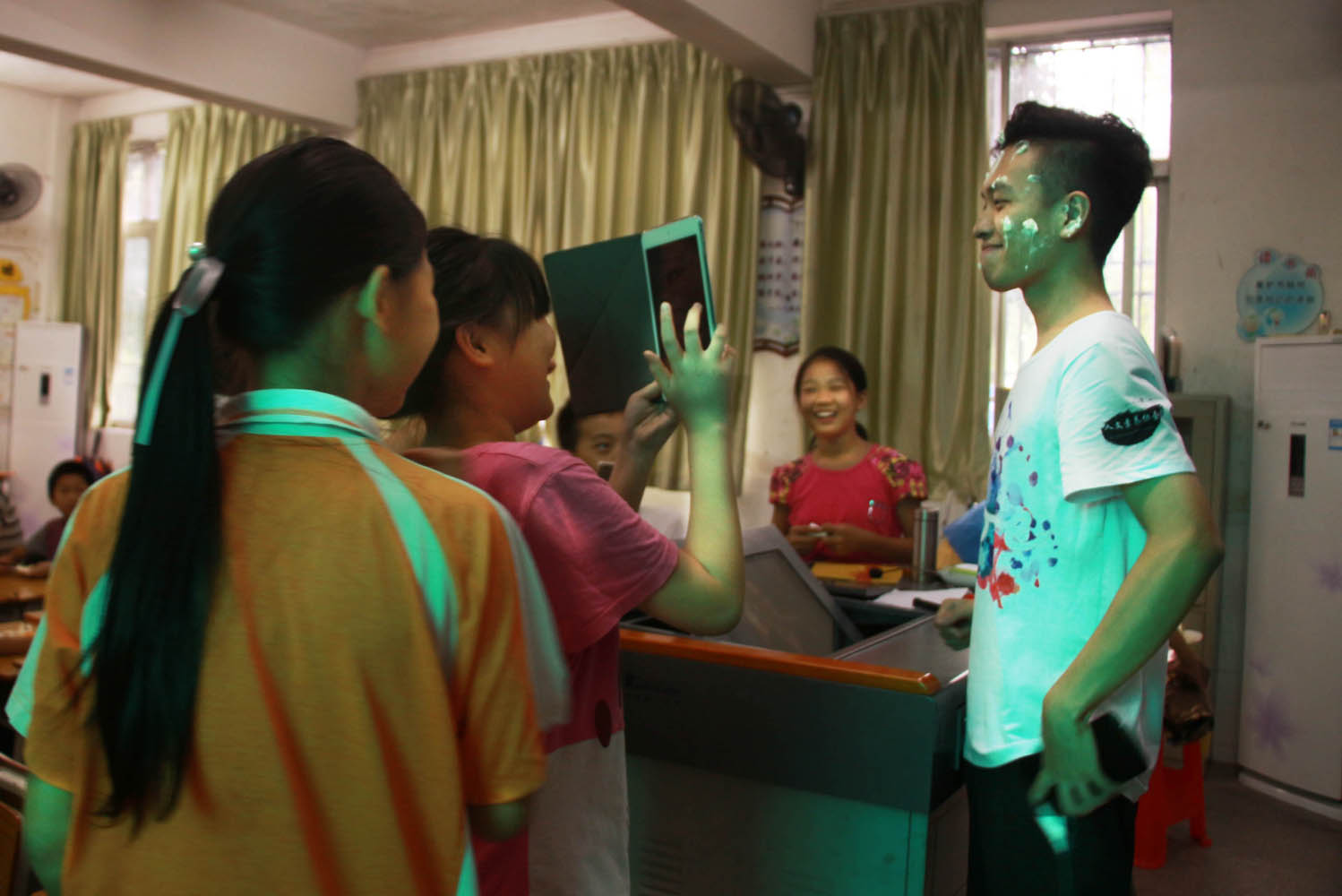 为了不耽误教学进程,朱老师继续刚才未竟的教学内容,而义教组的成员们则将蛋糕拿到课室外切好后分派给同学们。经过这段时间的接触了解,这位班主任对大家来说不止是老师,还是一位和蔼可亲的大哥哥,于是一些调皮的同学还借此机会将蛋糕上的奶油抹在朱老师脸上,惹得大家笑作一团,课室里一派其乐融融。