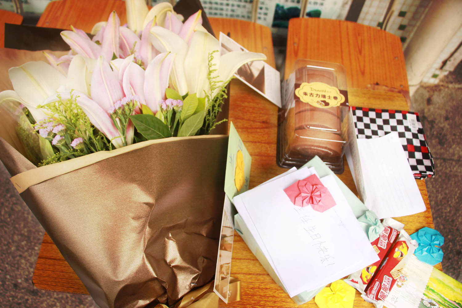 一曲终了,同学们纷纷送上自己对朱老师的生日祝福,有的同学准备了写着自己真挚祝福和心里话的贺卡,字迹稍显稚嫩,童心却一片赤诚;有的同学精心准备了有爱的小礼物,手工课上辛辛苦苦用纸折出的心,代表了自己对老师的一颗感恩之心;还有同学别出心裁地送了朱老师大捧鲜花,用百合的芬芳表达自己的深深祝福……但无论如何,礼轻情重,大家的心意都源自对朱老师的爱戴。感受到每一位同学的用心与真诚,朱老师感动不已。
