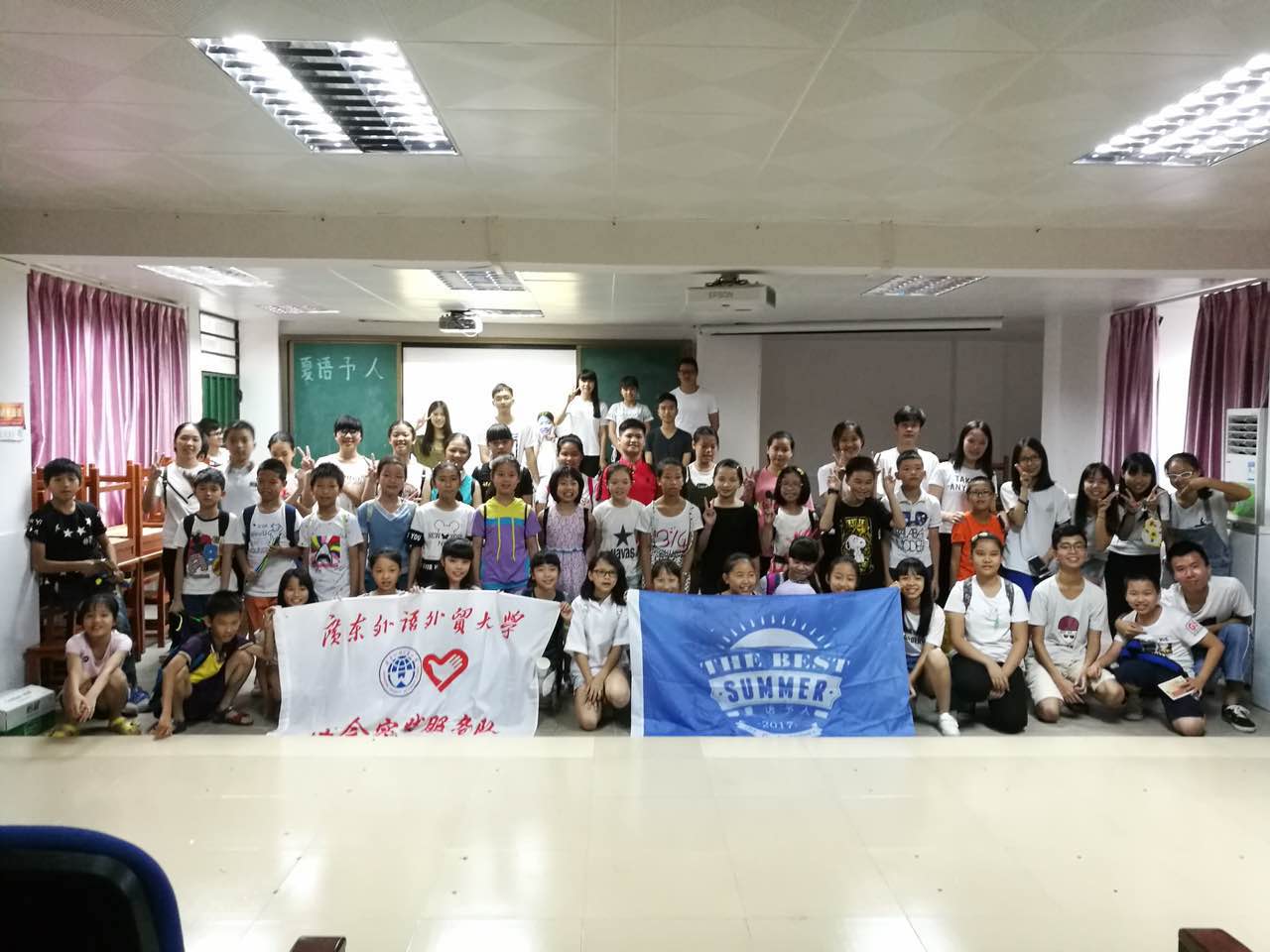 在学生们的欢声笑语中,闭幕式已落下帷幕。幕后,孩子们主动邀请老师们合影留念并献上小卡片对老师们的付出表示感激。最后,屏幕上出现:“有缘,广外见”。在不舍的气氛下,夏语予人服务队的队员们组织孩子们排好队,并护送他们过校门前的马路。