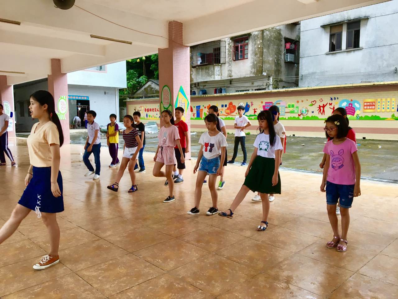 陈峥羽老师在架空层带领孩子们进行彩排