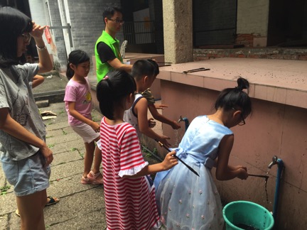 同学们有序排队清洗毛笔