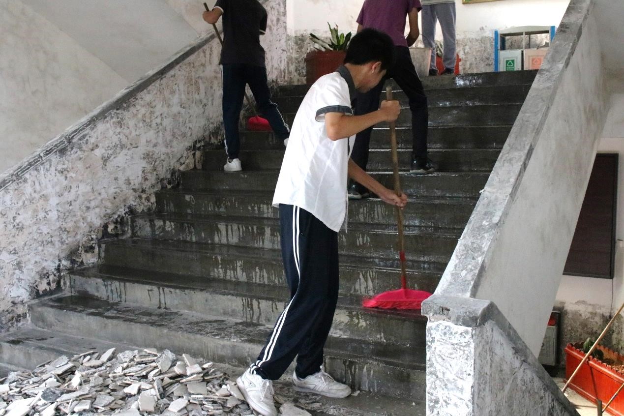 同学们清扫教学楼楼道