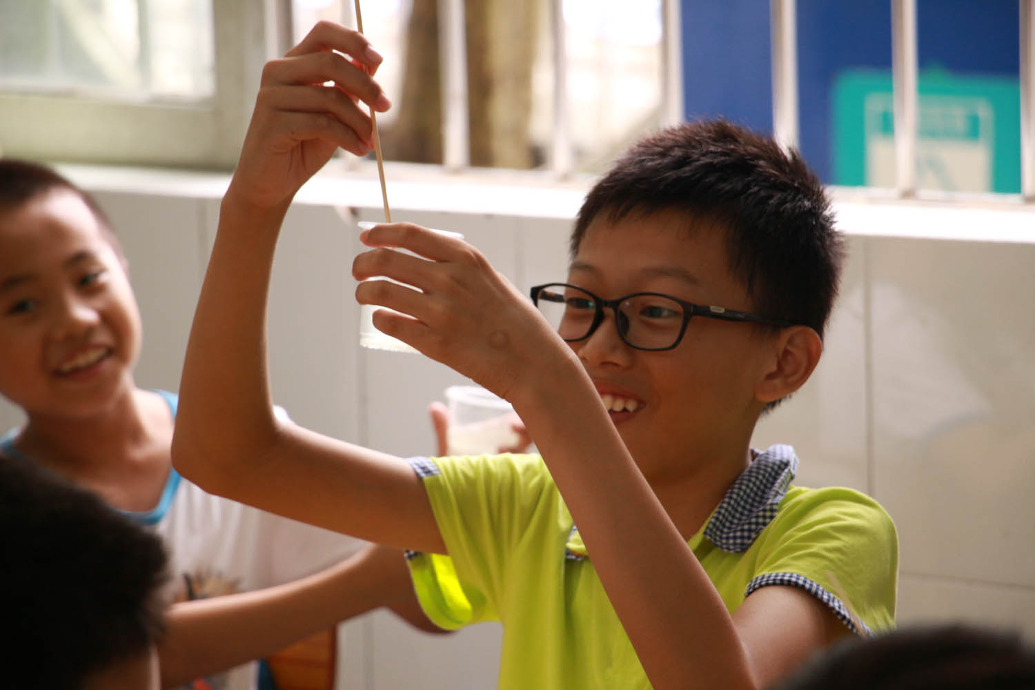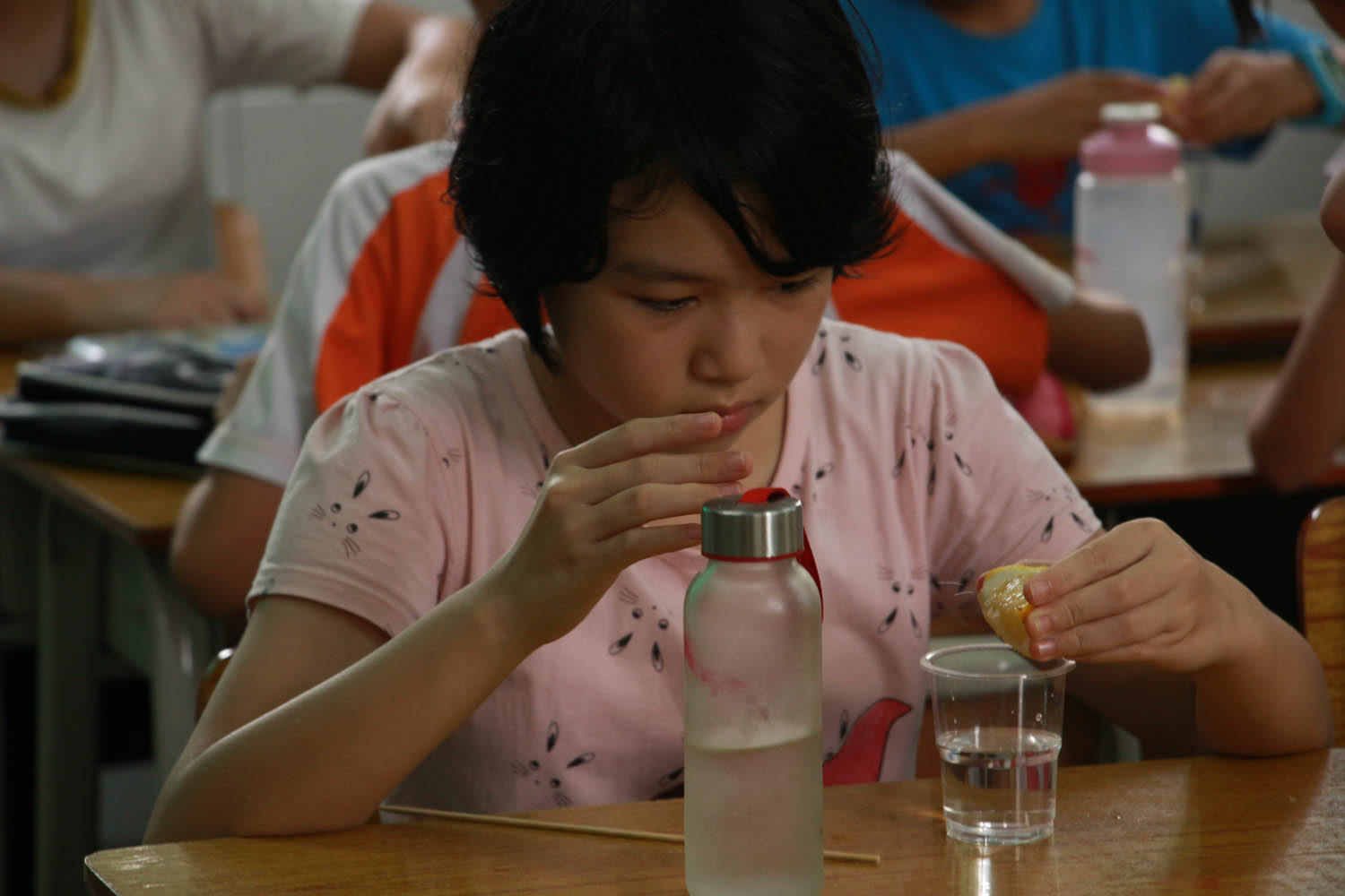 下午,做完眼保健操后物理课正式开始。这节课上,老师让同学们亲自动手做了两个操作简易却十分有趣的物理实验。一开始,同学们将老师准备好的柠檬挤出汁滴到水中,再加入适量的小苏打粉和白砂糖,经过搅拌,深受大多数同学喜爱的柠檬汽水就诞生了。“自己动手,丰衣足食”,尝到自己甘甜可口的劳动成果,同学们都打起了十二分精神,认真聆听老师讲解制作柠檬汽水的原理,一张张小脸上不时露出恍然大悟的神情。喝完了柠檬汽水,接下来就是神奇的墨水实验:首先用竹签蘸上墨水在水中轻点,墨迹遇水便荡开了圈圈黑色涟漪,这个奇妙美丽的现象让同学们乍舌不已;接着,用棉签在头发上摩擦,摩擦后的棉棒轻触水面,水面上的墨迹便避之不及地往周围散去,同学们哗然一片;最后,将宣纸盖在水面上,静待一会儿,就得到了一张好看的墨纹纸。老师向同学们讲解了其中蕴含的原理,原来是水面的张力以及毛细现象在“暗中作祟”。通过这节课,同学们又掌握了一些趣味十足又贴合生活实际的科学小知识,大家都十分开心。