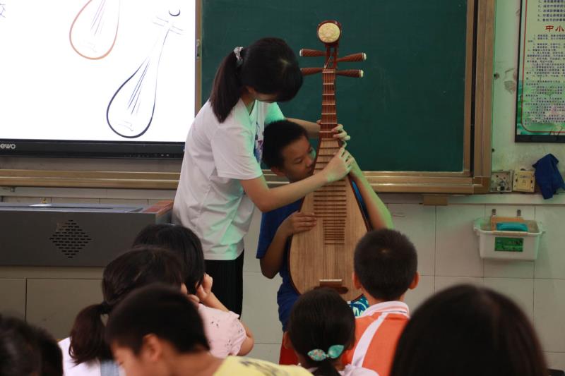 “葡萄美酒夜光杯,欲饮琵琶马上催。”“琵琶起舞换新声,总是关山离别情。”“浑成紫檀今屑文,作得琵琶声入云。”民乐交响曲课上,陈雪楣老师带领同学们从古诗中窥见琵琶的身影。从古至今,随着历史的车轮向前,琵琶也有了“前世今生”,朝代变迁其形状也在不断演变,陈老师将自己的琵琶搬上讲台,为大家细细介绍现代琵琶的结构组成。琵琶不像今日流行的吉他、小提琴等西洋乐器般随处可见,同学们瞬间被这古朴的“大家伙”吸引了目光,还有同学心急地催促老师“露一手”。纸上谈兵终觉浅,陈老师挑选了几位同学上台体验弹琵琶的基本技法,捺、带、擞、揉、滑、绞,同学们白嫩的小手可经不起琴弦的磨砺,顿时疼得龇牙咧嘴,但那粗韧的琴弦在陈老师的十指下却奏出了清脆明亮、空旷辽远之音,大家被陈老师的琴音折服,更是钦佩老师熟练高超的技巧,不由自主地鼓起掌来,对这新奇的乐器也愈加好奇,全神贯注地置身于琵琶的世界中。