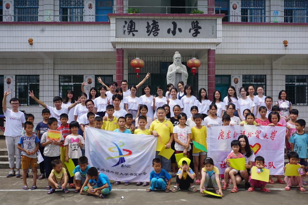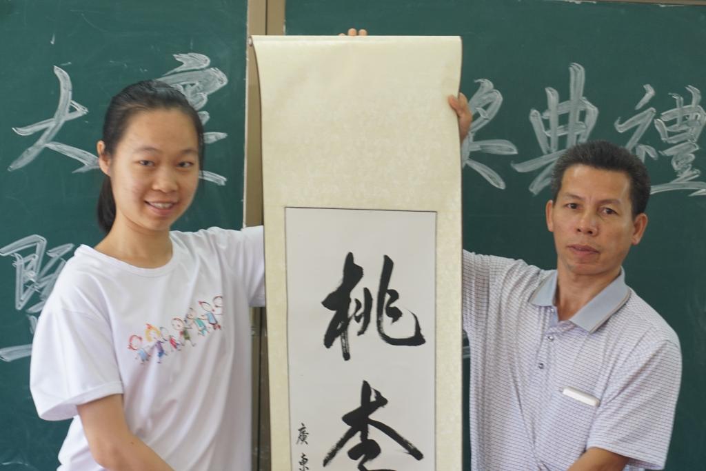 今日,是书画协会“心之航”三下乡志愿服务队在云浮澳塘小学义教0的最后一天,伴着清晨的阳光,所有“心之航”三下乡队员从民宿出发,沿着村间小道,走向澳塘小学。当汤秀盈队长在黑板上写下“书法大赛暨告别会”,今日的活动就正式开始了。张永新校长再次对广外同学的到来表示感谢,“10天工作,你们个个都勤恳、默默地在课堂上耕耘,毫无怨言,我代表全村村民和全体师生表示衷心感谢和崇高的敬意。”校长同时也谈到了在澳塘小学毕业的学生们以后的上学就业情况,鼓励这里的孩子们努力学习。汤秀盈队长则代表队员们向校长赠予了一幅字——“桃李芬芳”,祝愿校长能够有更多的优秀学子。同时,给队员们提供住宿的民宿主人张嘉洲的太太也到达了活动现场,汤秀盈代表全体队员向她赠予“积善人家”,对张先生和张太太表示感谢。