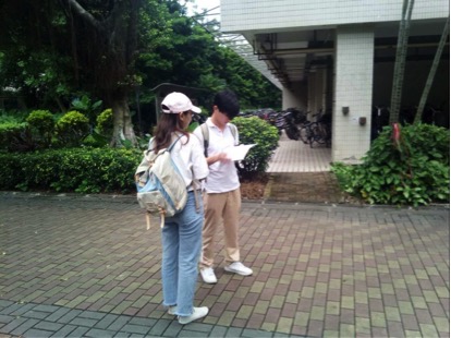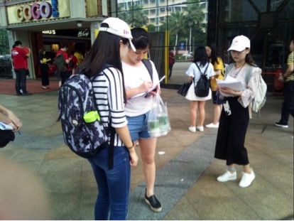 大学城占地面积34.4平方公里,共有10所大学,占地面积之大,所存高校之多,都对此次调研是不小的挑战。因此,调研队员制定方案为一天针对一所高校或商业中心进行实地考察并发放问卷,7月13日便首先在“Gogo新天地”进行了一次尝试性的实地调研,取得一定成效,随后则依次在广外、中大、广大、广大商业区、广中医、广药、星海学院、华师等地调研。