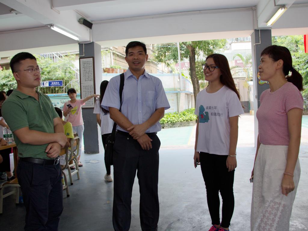 本网讯7月22日,是雷欧下乡的第十二天,教学的第十一天,今天还是个特别的日子,博爱小学校长以及各领导老师,广东外语外贸大学国际商务英语学院的党委副书记张林茂老师,2016级辅导员莫小俊老师特意前来博爱小学,慰问广外在博爱小学的两支三下乡服务队。