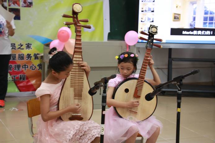 文化宴会,乐器怎能缺席?来自大班的刘志敏与来自小班的陈家欣同学用中国传统乐器琵琶和中阮合奏了一曲大家耳熟能详的《小星星》。刘志敏同学五天前初学琵琶,但在台上镇定自若,流畅完整地弹奏出了优美的旋律,赢得了满堂热烈的掌声。