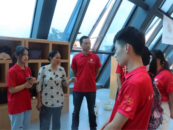 在展示中心,队员们看到了例如香包,短袖,颈枕等融入日常生活的苗绣制品,石丽平介绍,松桃苗绣目前是首个获得地理标识的证明商标。松桃苗绣通过与高校合作学习,在全国各地展示苗绣制品等方式促进松桃苗绣这一非物质文化遗产的推广。石丽平说道:“我们首先是应该要有文化自信,文化的自豪感,所以今年我们就是通过学校做宣传,让更多的年轻人走进非遗,了解非遗。”队员们了解到,近期高校通过建立校外实训基地,校企合作等方式促进苗绣文化走进校园,走进大众生活。同时,在国家艺术基金的支持下,更多青年加入苗绣的培训,参与到非遗文化的传承队伍中。更多青年投身文化传承建设,提高民族自豪感,增进文化自信,为我国建设文化强国注入源源不断的动力。