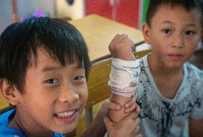 急救小技能的课程接近尾声,班上的同学都基本完成了自己的作品——将同桌的手臂完美包扎,不少同学举起手,展示着自己的成果,冲着老师展开笑颜。