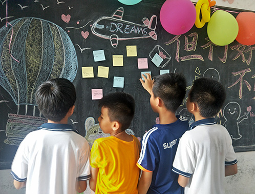 在见面会的最后,队员们带领同学们回到教室。队员们引导小朋友们在分发的便利贴上写下自己未来想要成为什么样的人。小同学们一笔一划,用心地在小纸条上写上了各种职业:医生、军人、警察……紧接着把它们贴在了课室后面的黑板上。小朋友们在笔下播种梦想,大朋友们在教学中承载梦想,也许这就是令这次社会实践活动最闪耀动人的一幕。