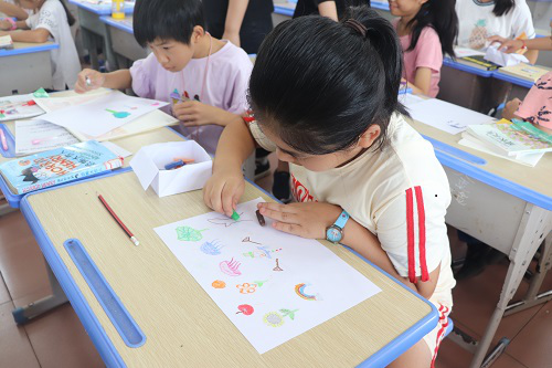 然后就是下一节课,奇思妙想绘画课。我们给同学们准备了画笔和画纸,引导同学们画出自己的奇思妙想,小朋友们的想象力远比我们丰富,色彩斑斓的水母在天空舞动,五颜六色的花朵对着太阳眨眼,蔚蓝的大海泛起层层浪花,他们勾画着自己心中的童话世界。黑板上也留下了他们的画作,让人不忍心擦掉。