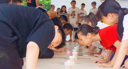 示范完毕,主持人的一声响亮哨声将气氛推向高潮——分组游戏正式开始!分组游戏在操场的三个游戏点进行,分别为:骨碌骨碌锤(空中投网球击倒装有不同水量的水瓶)、踩报纸过河(组员之间传递纸板并踩纸板到达终点)、千万别松手(坐地起身、4人5足和解手链)。各组经组内商讨权衡后决定三个游戏进行的顺序,发挥自身特长完成擅长的项目,同时缩小薄弱项目与其他队伍形成的差距。