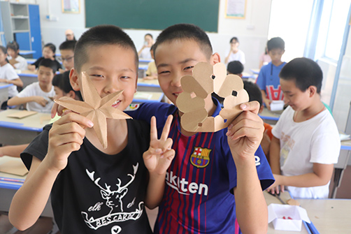 上午第一节是课是激发学生动手能力的手工课,在认真听完老师的讲解后,学生们开始自己动手操作。一张普通的手工纸摆在每位同学的面前,大家依靠自己的想象力和动手能力,把自己桌前的普通的纸剪成了各式各样的有趣小玩意——有的是露出两个尖尖角的小船,有的是张牙舞爪的章鱼,有的是开满“爱心”花瓣的花朵……大家的作品虽不一样,却都充满着童真童趣,在看到自己滑稽又可爱的作品时,大家的脸上都绽放出灿烂的笑容。