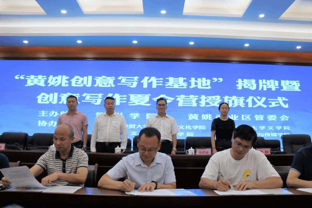 本网讯 2019年7月6日,我校中文学院在教学实践周和暑期三下乡活动期间参加了在广西贺州黄姚古镇举行的“黄姚创意写作基地”揭牌暨创意写作夏令营授旗仪式活动。本次活动由广东外语外贸大学中国语言文化学院、贺州学院文化与传媒学院、广西民族大学文学院、新余学院文学与传媒学院共同发起,与广西黄姚古镇旅游文化产业区管委会合作共建。出席活动的有贺州学院党委副书记毛芳才、管委会主任汤松波、贺州学院文化与传媒学院副院长蒲日材等领导,我校中文学院汉语言文学系主任朱志刚副教授带领中文学院创意写作夏令营的学生一起参加了揭牌和授旗仪式,并作为黄姚创意写作基地发起建设单位之一代表发言。