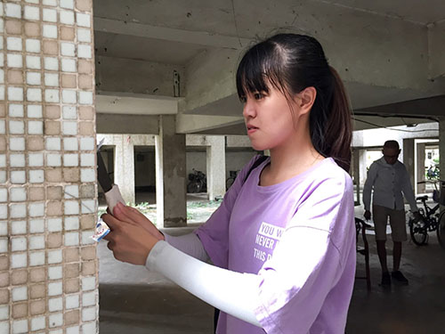 在棠德社工服务站工作人员的牵线搭桥之下,我队成员积极参与到这一活动之中。7月9日上午9点,他们备好清洁要用的铲子、水桶、垃圾袋等工具,对棠德社区内的“牛皮藓”进行地毯式清理。对于大多数“牛皮藓”,队员们用铲子慢慢将其从墙上铲除,并尽量避免伤害墙面。而对于那些使用双面胶粘贴、难以清理的,就用水先将其浸湿,再用铲子、铁刷一点一点地铲除掉。