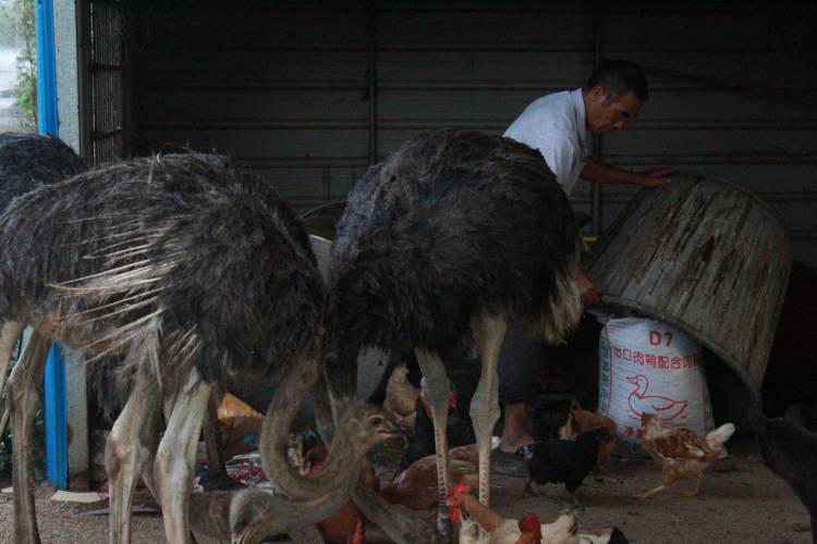来到富礼村,一位养鸵鸟的村民接受了我们的采访。据村民所说,他去年主要种植沙糖桔,但是由于市场不好,沙糖桔的销量偏低。所以今年他转变方向,开始养殖鸵鸟。该村民从肇庆一家公司购入鸵鸟种苗,待鸵鸟体重达到两百斤左右,又返售回原公司,从而获得收益。虽然养殖鸵鸟对技术要求不高,但是鸵鸟幼崽时期对温度要求比较严格,需要在暖灯下进行控温养殖。在村民的悉心照料下,驼鸟们长得非常好。今年上半年,该农户已售出十几只鸵鸟,成功改善了生活。