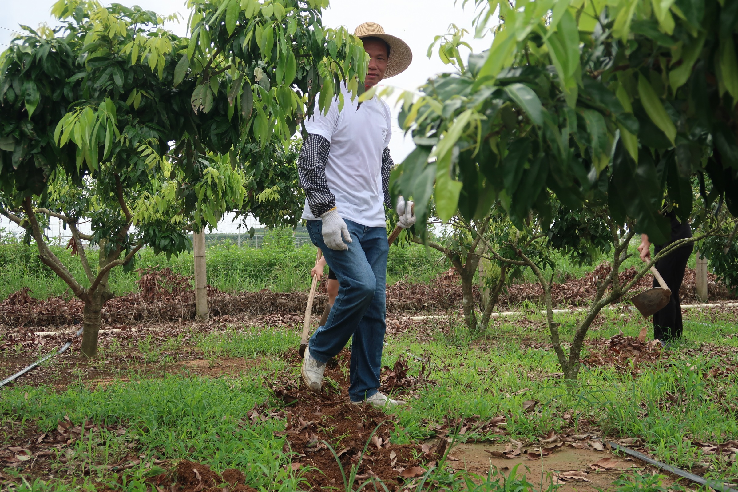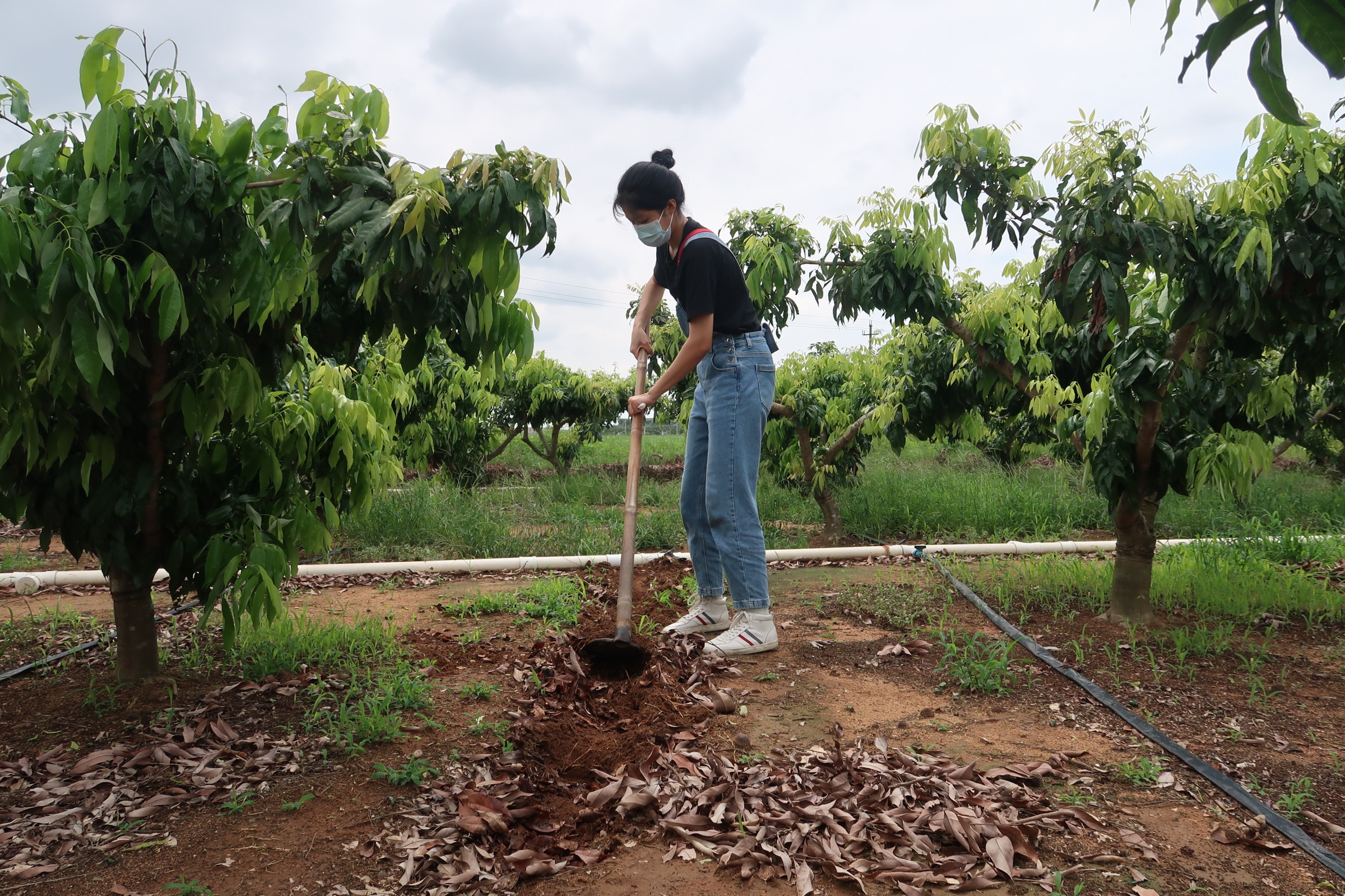 在和赵尾短暂交流后,他带领我们前往他的龙眼园进行参观,并向我们介绍他的种植经历。随后,夏乡之源服务队的队员们在赵尾的耐心指导下也亲自下地体验劳作,开挖排水渠,除草等,队员们在切身实践中体验到了农活的艰辛,更加体会到农民们的不容易。赵尾发挥热心好客的淳朴品质,给服务队队员们休息期间提供了在炎炎夏日下去除暑意的菊花茶和晴天的哈密瓜。服务队队员们在田间度过了愉快的下午。