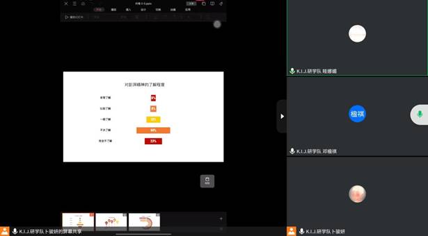 至此,K.I.J.研学队“三下乡”线上调研成果展示会正式结束,这次展示会也为本次的研学活动画上圆满的句号。K.I.J.研学队15名队员在调研中积极展示团队风采、展示会院学子风采,在研学活动中承担了青年所应承担的使命和责任,积极研究以彭湃精神为代表的红色精神的传播方式与传承效果,探究如何更好地传播红色精神,让红色文化内化于心,外化于行。此次研学使队员们不仅在个人能力上有所长进,也在思想上有所进步,实现了调研能力的提升。