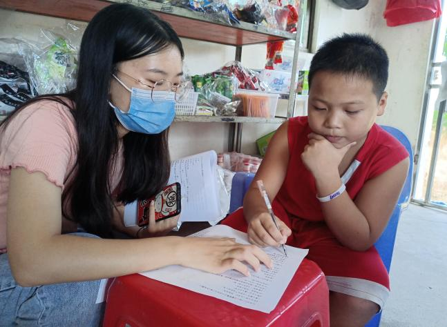 (本队队员指导小朋友填问卷 周咏诗摄)