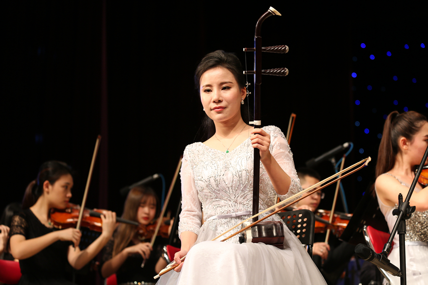 随后,刘贝妮老师拉奏着二胡,与管弦乐团一起演奏了由周杰伦原作、陈燮阳改编的《菊花台》。小提琴与二胡交错奏乐配合默契,是中西音乐艺术的一次交融与尝试。二胡琴弦中泻出流畅的音乐,是中国风独有的味道;而交响乐奏出的澎湃,又是西洋音乐的特色,两者完美结合,为听众献上了一场别出心裁的演奏。
