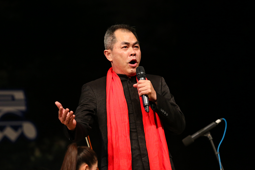 著名男中音歌唱家、我校退休教师温恒泰登场时,让人眼前一亮。黑衣笔挺、红巾亮眼。“我和我的祖国……”歌声嘹亮,响彻会堂。他的举手投足间,尽显淡定从容,眼神闪烁光辉,用歌声表达对祖国的热爱。