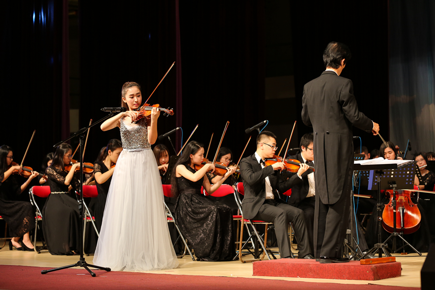 灯光缓缓亮起,琴管笛等多种乐器互相呼应,激昂而不失轻缓地为听众带来了《蝙蝠序曲》。这首乐曲选自约翰·施特劳斯作曲的著名轻歌剧《蝙蝠》,让观众耳目一新。随后,小提琴手陈瑗与众多乐器一齐演绎了一曲精彩动听的《梁山伯与祝英台》。在乐团和小提琴的悠扬协奏下,这首大家都耳熟能详的乐曲弦弦扣人,深深地打动了听众。