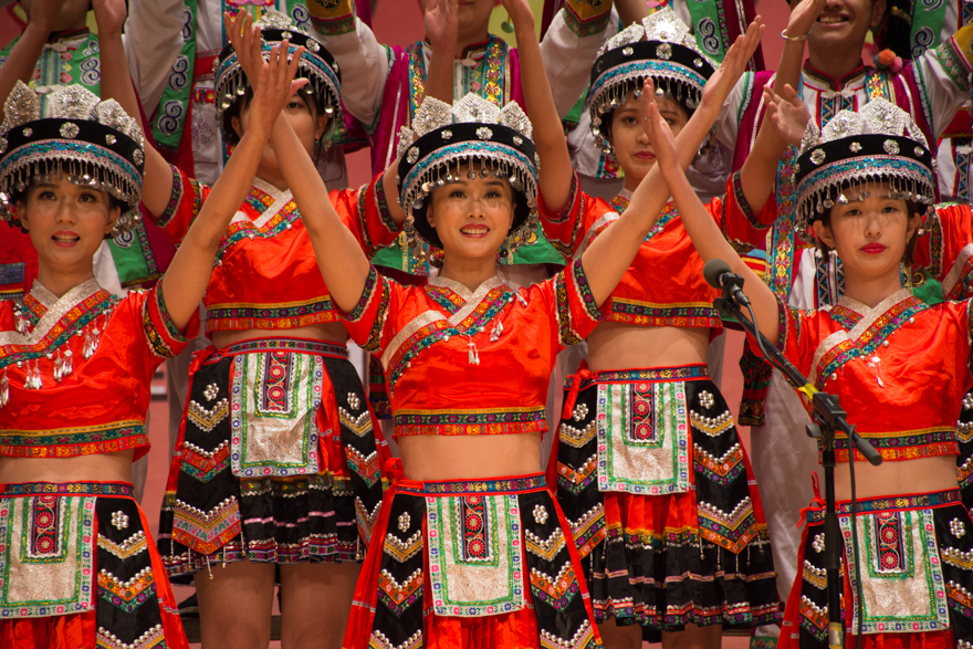 这次的比赛中,有几个学院身着少数民族服装,唱出少数民族独特的红歌情怀。商学院的《情深谊长》用歌声诠释彝族朋友欢迎红军到来的盛况。身穿彝族服装的女生,裙摆如云中彩雀,随着音乐摆动,表现少数民族朋友对红军的热烈欢迎。