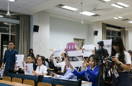 在评委点评环节,侯迎忠对本届模拟新闻发布会的创新比赛形式以及同学们的参与热情给予了充分肯定。对于两个发布组的表现,他首先肯定了研究生队伍准确概括关键、权威信息以及应对刁钻问题的能力;而全新闻1401班创新的发布形式与主发言人的精彩表现给他留下了深刻印象。在点评记者组时,他认为记者能够针对发布会主题提出尖锐问题、全媒体技术应用能力强、整体播报水平高都是好的方面。侯迎忠提出,不管是发布组还是记者组,在内容上的竞争力还有待提高,发布组均存在通稿质量欠缺的问题,而记者组的新闻稿件中也存在把现场信息硬性塞进提前准备好的稿件中的现象。他呼吁同学们关注新闻质量本身:“虽然在形式上做得更创新、更有趣、更可视化,但是内容有没有竞争力依然是最关键的问题。现在新闻竞争这么激烈,我们最终竞争的不是形式,不是技术,关键就在于应变能力、现场写作的能力、快速制作内容的能力,这也值得大家今后关注和注意。”